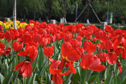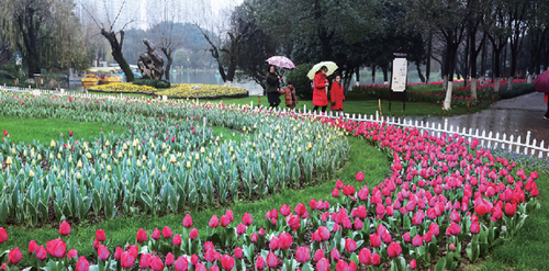 近段时间,春雨绵绵,市区马鞍池公园的郁金香花盛装亮相,红、黄、橙、紫、白各种花色品种的郁金香花在雨中绽放。
