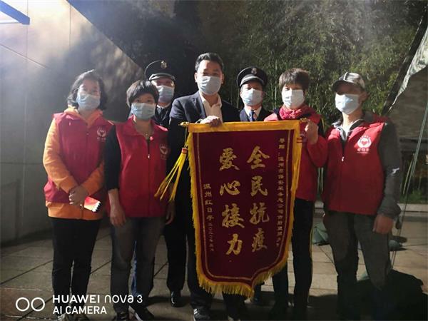 温州红日亭义工是一群自发组织的抗疫逆行者,看到了奋斗在一线的保安战士,他们也想以自己的方式助力抗“疫”一线。红日亭的爱心义士每天从起早贪黑,忙到深夜,做好百份的爱心餐,开出两辆面包车,将爱心餐送到防疫执勤点和卡口的工作人员手里,为他们送去香喷喷的早饭,热腾腾的宵夜。坚持至今,风雨无阻。 红日亭的爱心举动极大的激励了队员们的士气,为将这份精神和爱心传递下去,温州保总驻市行政中心保安大队踊跃地向红日亭发起爱心捐款。在大队领导的带头下,队员自愿捐款,于3月25日,共60名队员完成线上线下捐款,捐款总额2100元,于当晚送到红日亭义工的手里。 虽然捐款金额不高,但都包含着温州保总队员们的心意。3月28日,红日亭为温州保总的爱心捐赠赠送锦旗,锦旗上写着“全民抗疫、爱心接力”。队员们表示这是应该做的,在灾难面前,众志成城,守望相助,我们必将共渡难关。