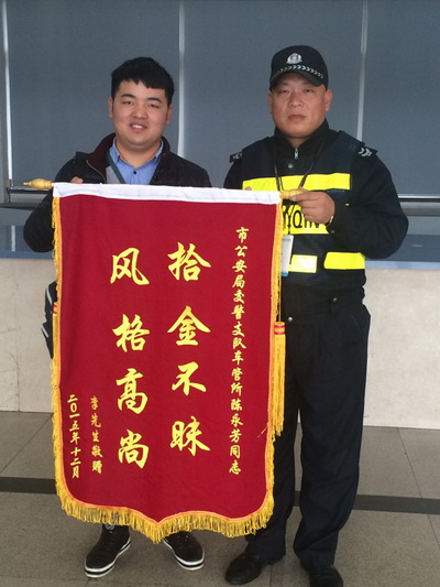 12月23日,安徽籍市民李先生手捧写有“拾金不昧 风格高尚”的锦旗专程来到温州市车管所,对保安队长陈永芳捡到钱包并主动归还的举动表示感谢。 事发当日早上6点多,温州市保安服务总公司派驻车管所保安中队队长陈永芳,在上班途中经过双屿天桥下时捡到一个钱包,发现里面有现金若干,银行卡、身份证等各类重要证件,他在原地等了半小时后也不见有人过来询问,就先回到单位里上班,并通过多方面渠道终于联系到失主,原来失主是一名在温州开出租车的司机。当李先生接过失而复得的钱包时感动万分,连声称赞车管所保安员品德高尚,急忙拿出500元钱表达谢意,不过被陈永芳队长婉言谢绝了,这才出现了本文的开头的一幕。 五大队:单显绿 |