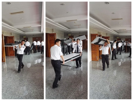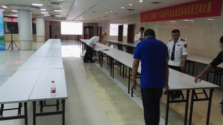 10月15日,由温州市精神文明建设指导委员会办公室和温州市机关事务管理局共同主办的2016“文明餐桌”行动温州市机关食堂标准菜肴烹调比赛,在温州市行政管理中心食堂隆重举行,全市共35支参赛队伍、98名人员参赛。 公司市行政中心直属大队接到通知后,按机关事务管理局的要求,在比赛前一天抽调十多名保安队员将会场的桌椅进行重新布置。从市人民大会堂搬运桌椅到市行政中心食堂,再把食堂二楼原有餐桌椅搬空,队员们细化任务,明确分工,仅用了三个小时将120多张桌椅整理完毕。 比赛当日,所有参赛选手必须持证入场,队员们严格证件检查,严防无关人员进入,还特意安排8名队员协助现场管理, 全力做好现场执勤保卫工作,确保会场的安全。比赛结束后队员们又动作迅速的将桌椅重新摆放原位。 由于先前安保工作准备充分,此次比赛各项工作有条不紊的进行,队员们履职尽责,文明执勤,以热忱的服务和良好的风貌,圆满完成了安保任务。